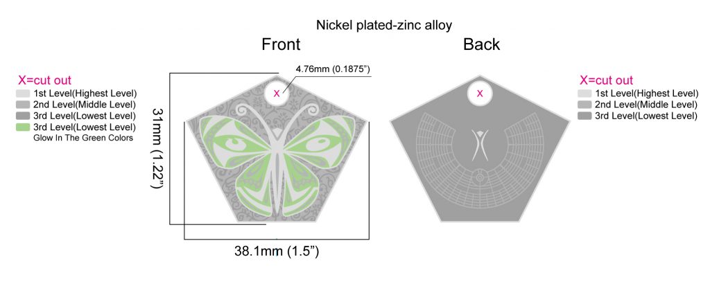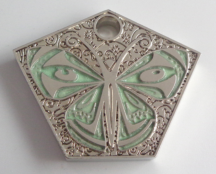 Behold MothMan!, the KK2019 playa pendant created by G-Man and Costume Jim. On the front, we mashup the Man with the KK logo and a metamorphic moth with the playa design and trash fence line on the back. Inspired by the art we made for Black & Light Ball, the front includes glow-in-the-dark enamel to illuminate the wings and the recessed designs in the background can be filled in with other colors to customize to your taste. In shiny silver alloy, the raised bits will stay shiny while the lower bits will become darker. (the front/ man design will pop better as it ages)